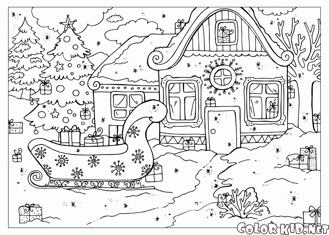 Puede descargar e imprimir las páginas para colorear para niños Hut Santa Claus desde nuestra web.